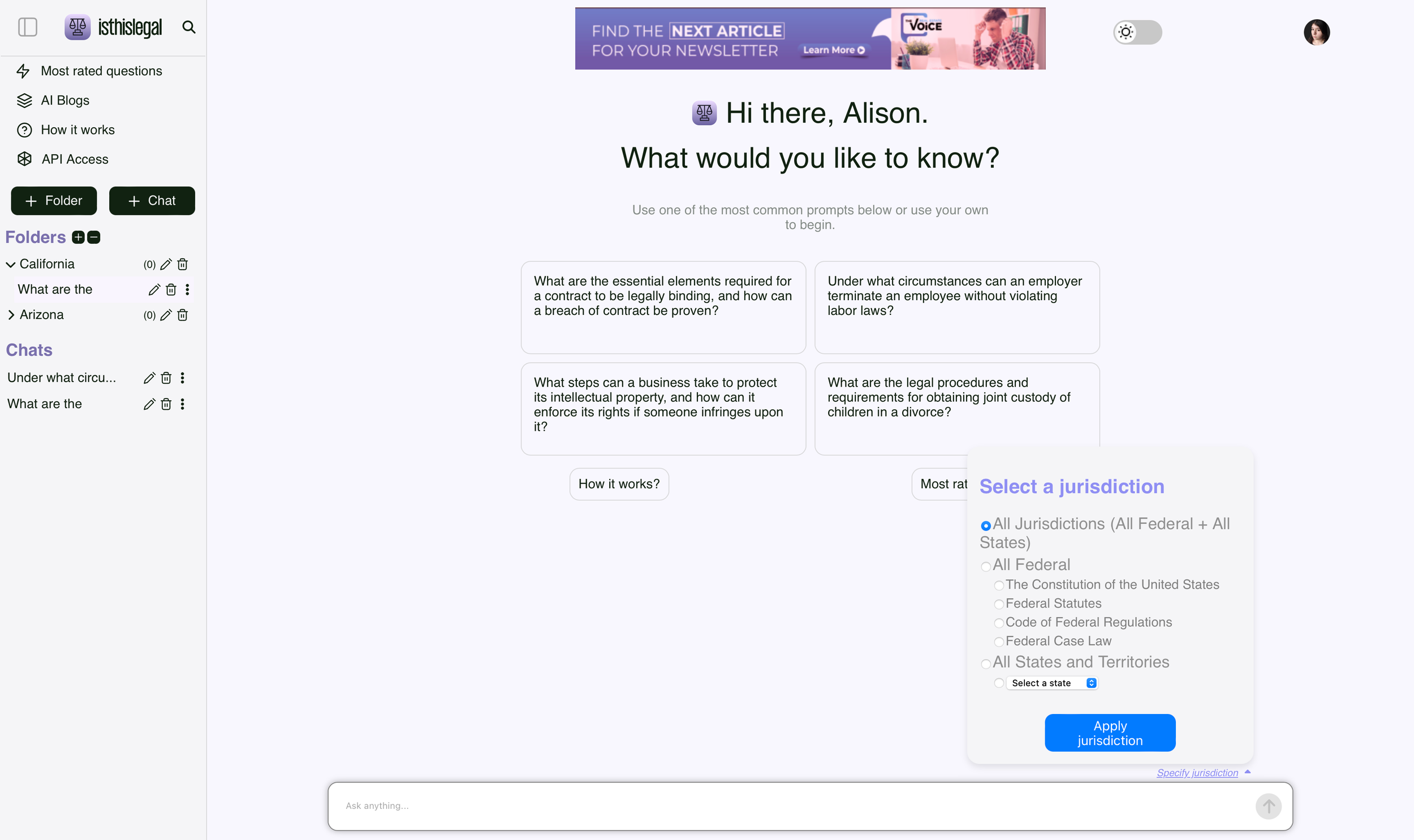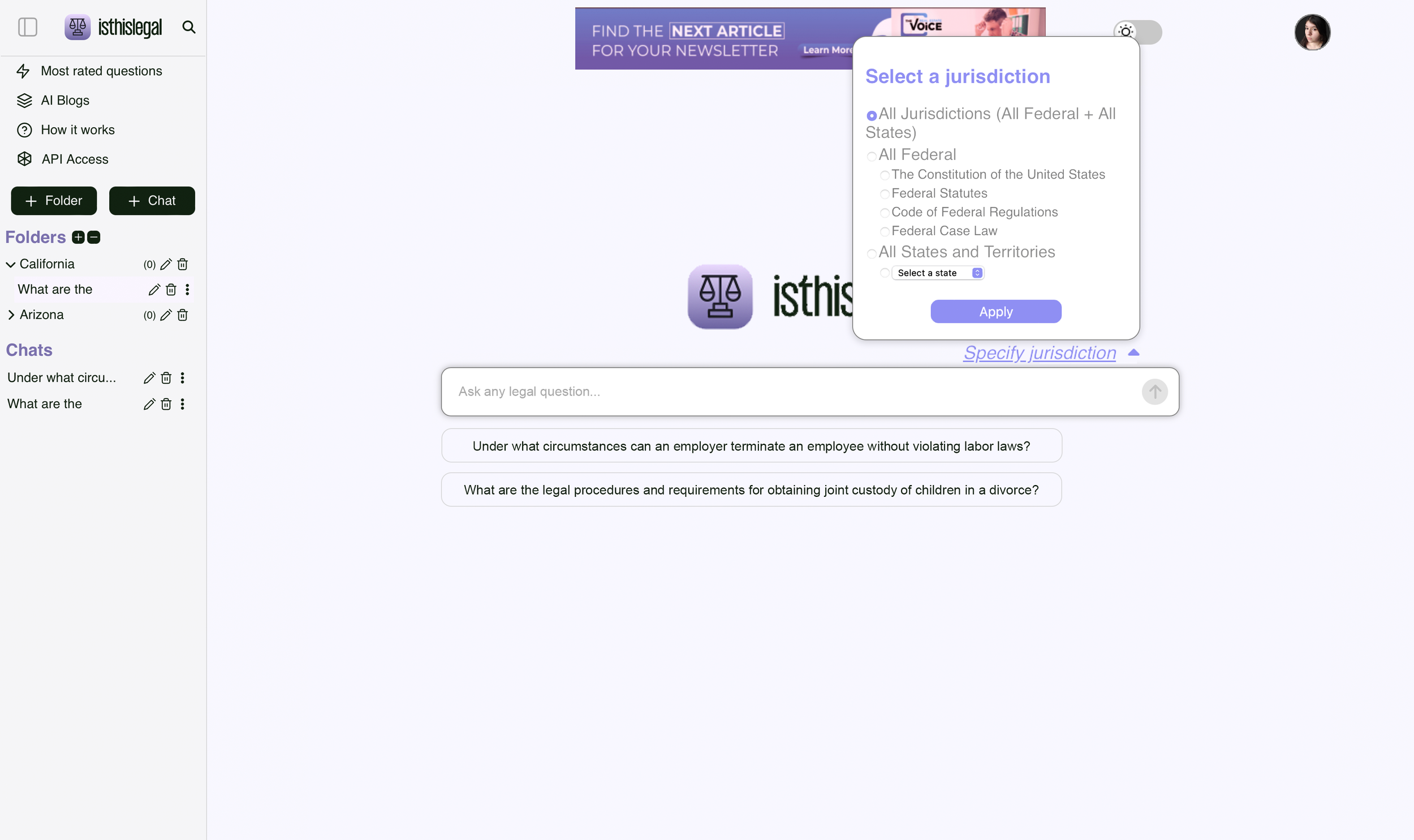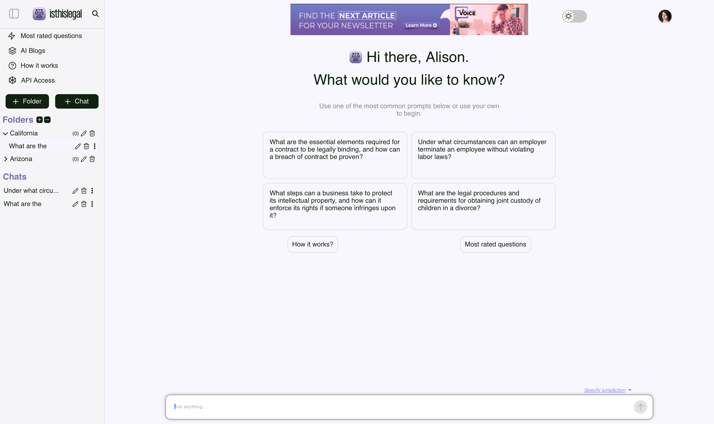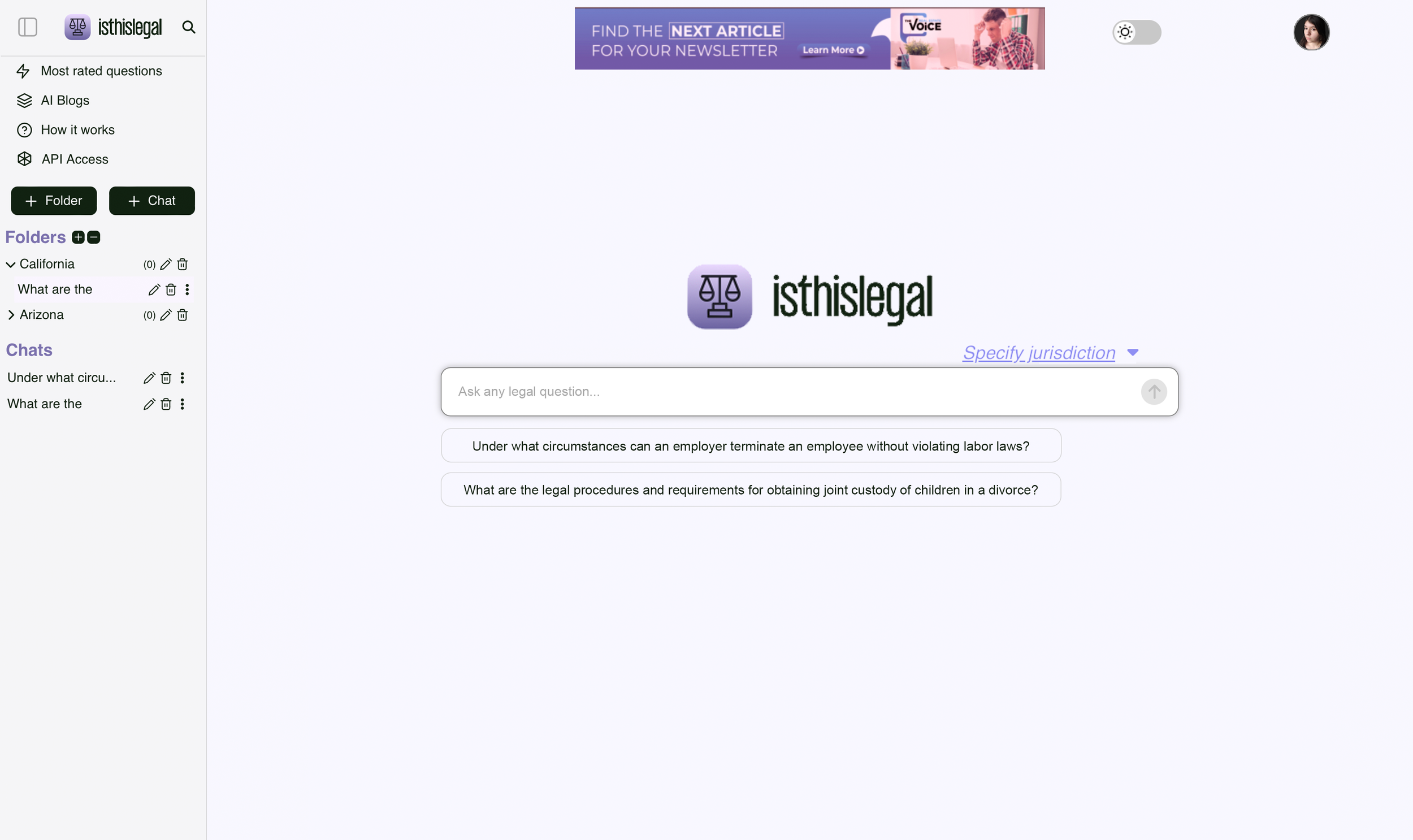 Isthislegal is a search engine for legal questions. The original design was cluttered. The search bar is not visible right away and the “specify jurisdiction” tab is so small that it goes unnoticed. My design removes the unnecessary words and highlights the brand name as well as the search bar. The prewritten prompts are under the search bar, simulating the suggested entries that come up when typing. The words “specify jurisdiction” are larger so they are more visible. The tab that appears has been changed to the brand colors and slightly shortened in height. Finally, the profile picture at the top right of the screen has been enlarged slightly for visibility.