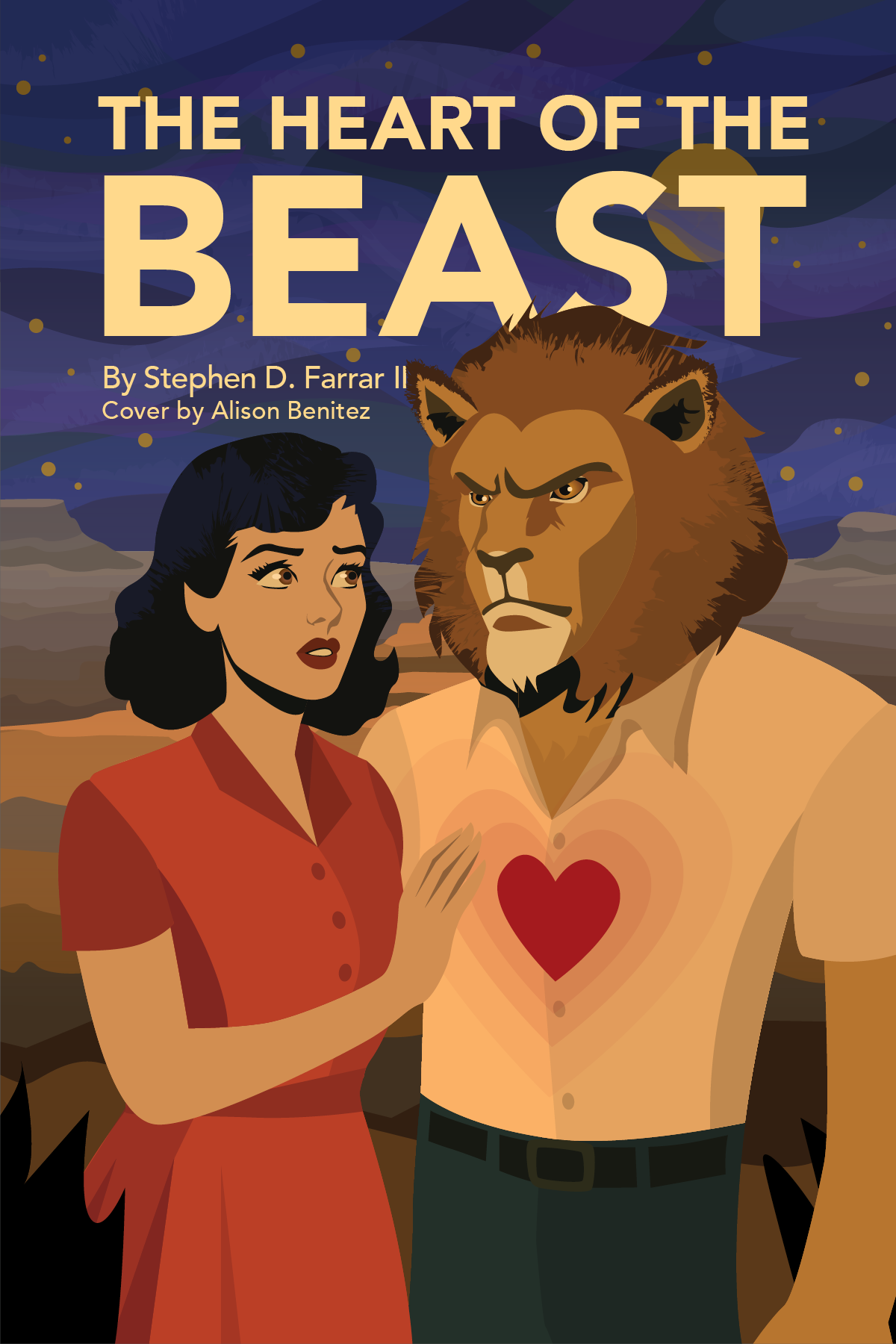 The outfits on the cover are inspired by clothing from the 1950’s. For the background, I created a quiet night on the grand canyon. I found many references for this but used artistic liberty when drawing the lines. A brush was used to create the textured hair of the Beast and add a subtle highlight to the woman’s hair.